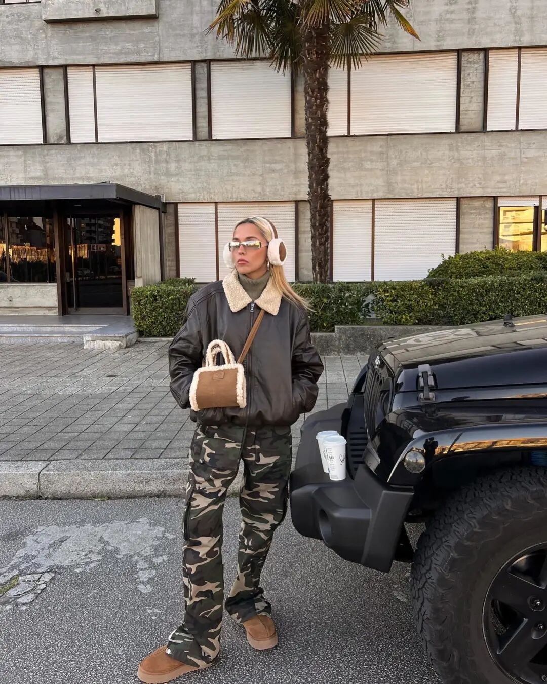 迷彩褲搭配卡其綠的飛行員皮夾克,內搭高領毛衣,將整體顏色統一為相同的色調,毛茸茸的配飾也加分不少,讓造型更有分量感。