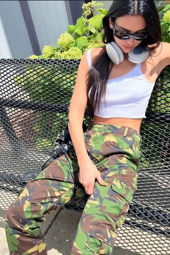 和貝拉同為千禧復古接班人的Dua Lipa也沒錯過迷彩褲,上身簡單搭配迷你小吊帶,配上頭戴式耳機更有復古的感覺。