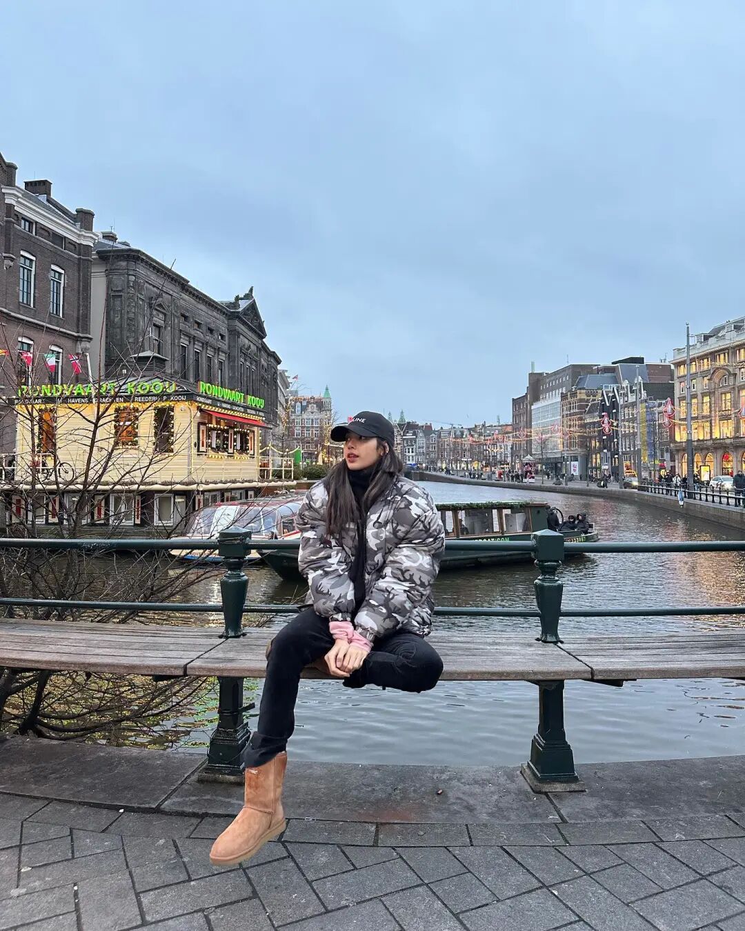 同隊的Lisa也超愛迷彩,選擇迷彩圖案的羽絨服夾克,內搭和下裝選擇黑色,再用雪地靴完成整個造型,早春這樣穿保暖又帥氣。
