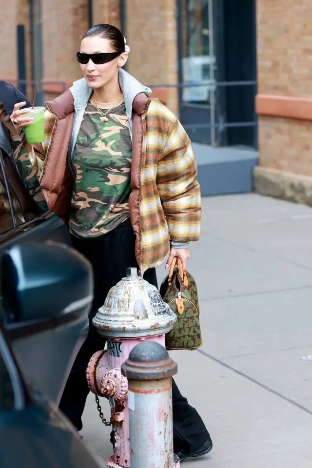 貝拉出街就用格子外套內搭迷彩服,前衛又調皮,和手上軍綠色的LV包包十分Match。