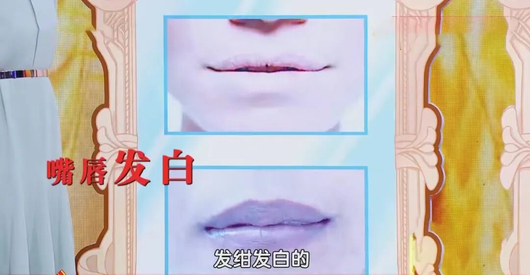 上圖,上嘴唇發紺發白,屬於氣血榮養不到位的一種表現;