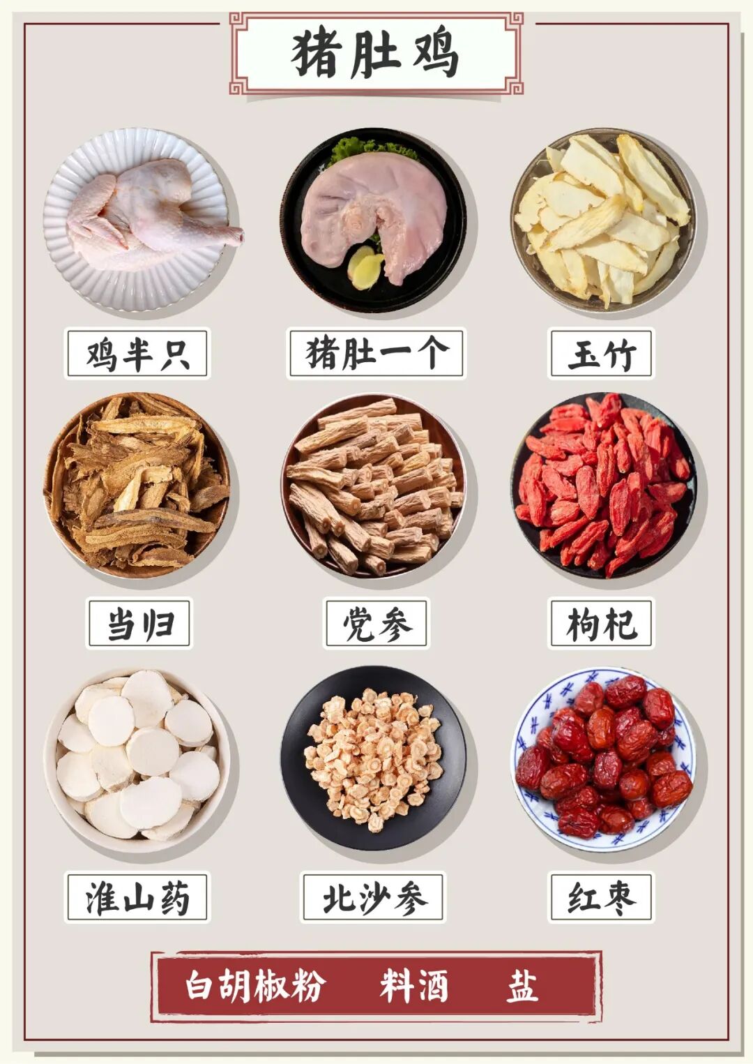 【食材】:雞半隻、豬肚一個、玉竹、當歸、黨參、枸杞、淮山藥、北沙參、紅棗、薑片、白胡椒粉、料酒、鹽
