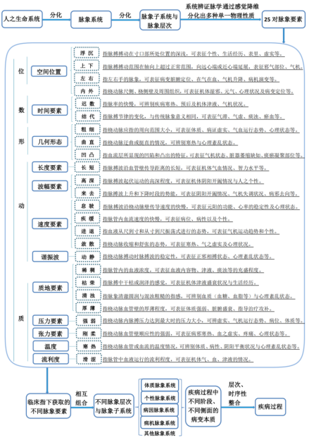 系統辨證脈學將系統科學納入脈象研究中,認為脈象是一個複雜的信息系統,其對於疾病過程中的任何環節或層次都有客觀的表徵作用;脈象信息可分化為多種物理性質,系統辨證脈學運用中醫學、認知心理學、現代信息學和物理學的基本原理將複雜的脈象系統分化出25對單一屬性脈象要素。以系統中醫學理論來分析脈象要素及要素髮生的內在機理、脈象要素之間的關聯與邏輯關係和表徵疾病發生髮展的病因、證候、病機及西醫疾病的客觀“證據鏈”,同時分析整合脈象系統所表徵的機體狀態和層次,可全面認識整個疾病過程(如圖)。