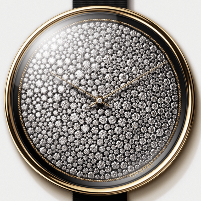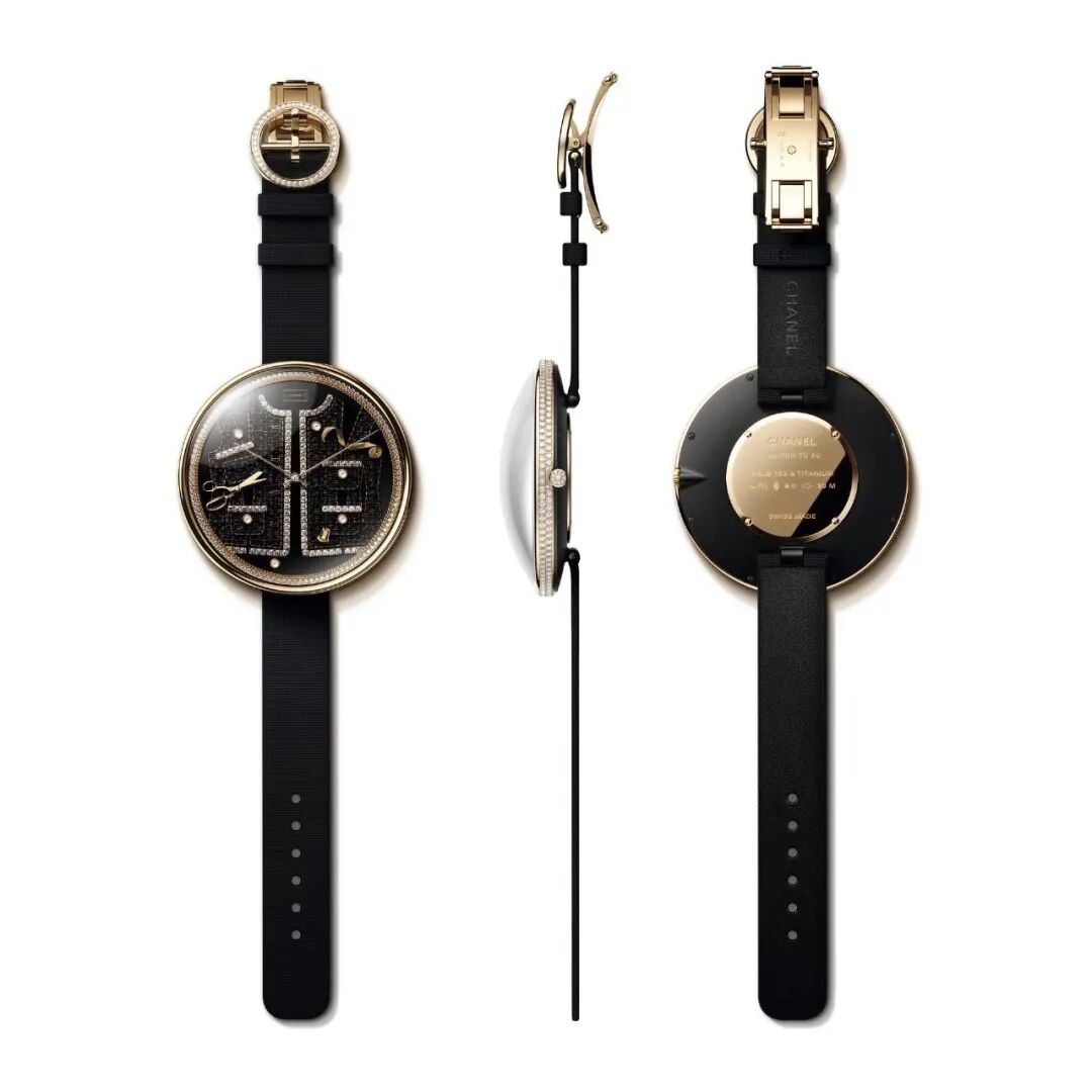 55mm的超大表徑,反而給5枚腕錶的錶盤帶來了更多的發揮空間。錶殼側邊鑲嵌了兩圈小巧的鑽石,搭配上黑色羅緞錶帶,在保證腕錶藝術感的同時,也融匯了香奈兒本身的優雅魅力。