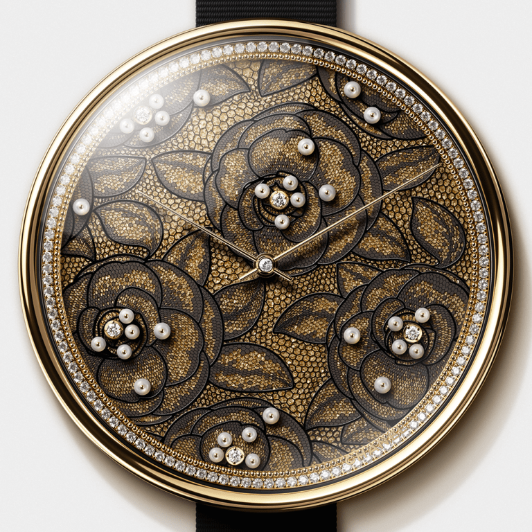 腕錶以香奈兒經典的山茶花為主要元素,在18k金的錶盤上雕刻出紋理,再覆上大明火琺琅,為雕刻工藝增加層次感,最後再用香奈兒傳統的貼花印刷技術繪製山茶花圖案,一層一層地鋪貼就營造出了蕾絲質感。