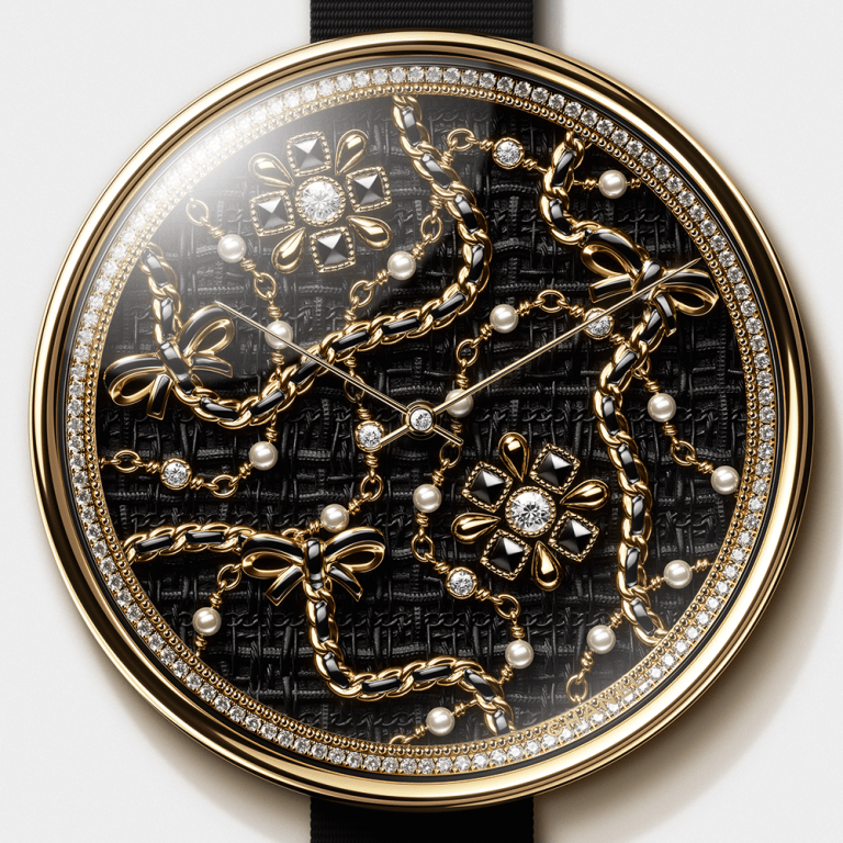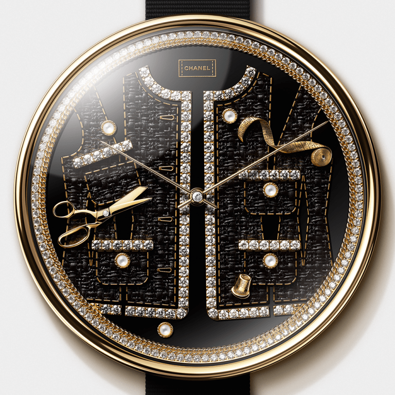 同樣是在錶盤運用斜紋軟呢面料元素,這款則更多地傾向於展示珠寶,胸針、皮穿鏈、項鍊散落在斜紋軟呢浮雕的效果上,每件微型珠寶均由黃金雕刻並手工塗漆,鑲嵌珍珠、鑽石和瑪瑙。