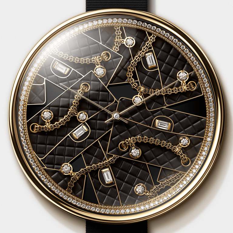妹子我猜這款應該是最快售罄的,因為錶盤上全是香奈兒大熱的「2.55口蓋包」。在黑色珍珠母貝錶盤上雕刻出了菱格紋的皮革質感,黃金包鏈貫穿其中,效果直接拉滿。