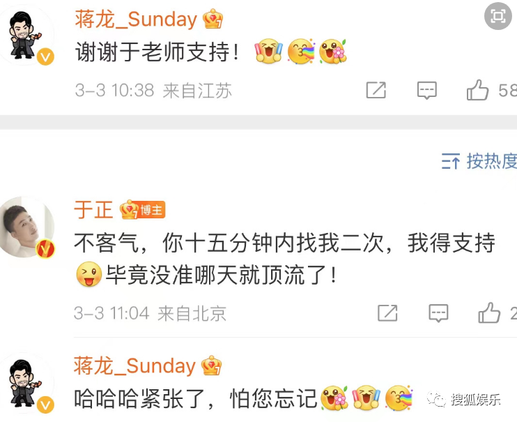 沒想到於正卻回覆蔣龍:“你十五分鐘內找我二次,我得支持,畢竟沒準哪天就頂流了!”
