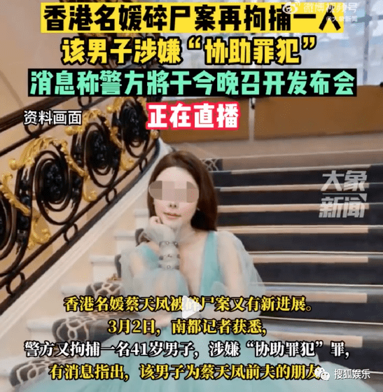 據港媒,3月2日,香港名媛蔡天鳳被碎屍案又有新進展,警方又拘捕一名41歲林姓男子,涉嫌“協助罪犯”罪。據悉,該男子為蔡天鳳前夫的朋友。