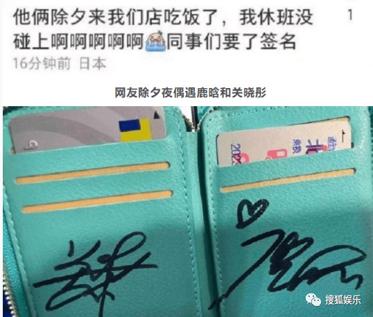 有網友在社交平臺曬照稱鹿晗和關曉彤除夕去他們店裡吃飯了,自己的同事還要到了簽名。