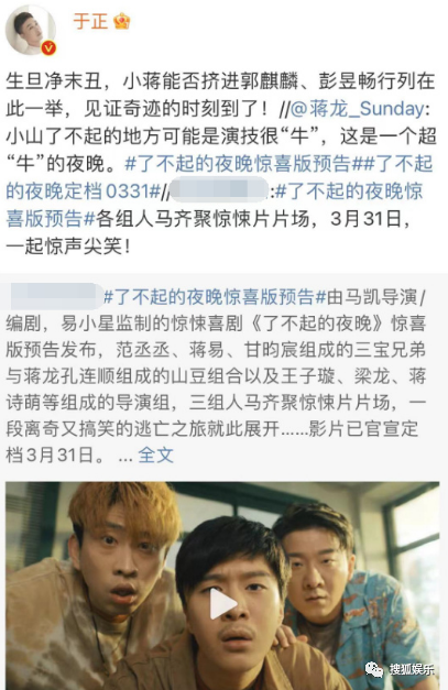 今天,演員蔣龍找於正幫忙宣傳自己的新電影《了不起的夜晚》,在於正轉發後,蔣龍對他表示了感謝。