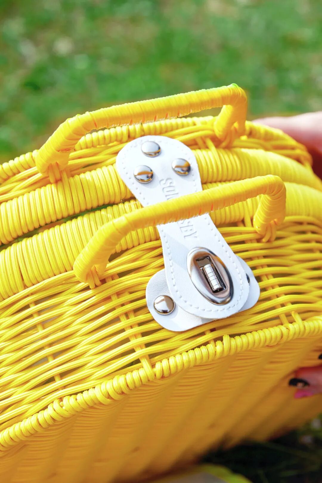 亮眼的明黃色、精緻的編織工藝,開口部分通過皮革與鉚釘的質感進行碰撞,整體復古而不失優雅。