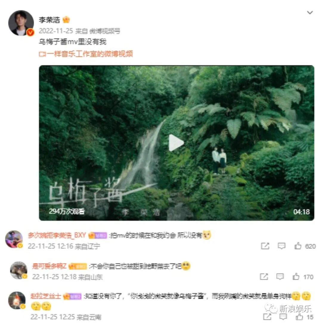 在李榮浩分享《烏梅子醬》MV這條微博的評論區,歌迷自發玩梗,“烏梅子醬MV裡沒有我”“拍MV的時候在和我約會,所以沒有”、“不會你自己也被甜到挖野菜去了吧”、“你淺淺的微笑就像烏梅子醬,而我咧嘴的微笑就是單身狗樣”。