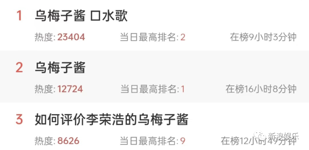 截止到發稿前,李榮浩的《烏梅子醬》已經在微博上斬獲了20多條熱搜,相關話題的閱讀量高達4.5億。