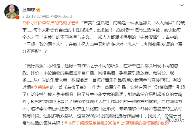 樂評人丁太升對這首歌的評價在微博自然發酵引起熱議後,微博選擇第一時間營造一個客觀的討論場域讓樂評人和博主來客觀評價《烏梅子醬》,順勢發起話題#如何評價李榮浩的烏梅子醬#,呈現多元化的觀點交鋒。
