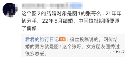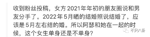 有粉絲爆料說,根據女方2021年年初朋友圈可知,她與男友分手,但去年5月曬了結婚照,也就是2021——2022之間兩人感情可能有拉扯,分分合合的。