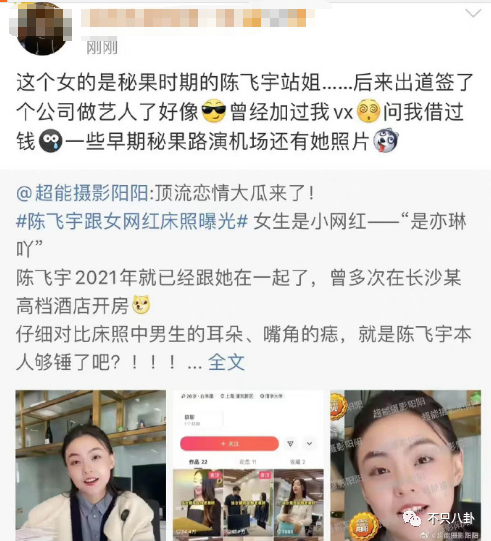 在攝影陽陽爆出床照後,一位追星圈的網友立馬認出,和陳飛宇同住的網紅【是亦琳吖】,她其實是陳飛宇拍攝《秘果》時的站姐,並透露這位女孩後來出道簽約做藝人了…….