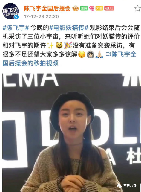 陳飛宇曾參演他爸陳凱歌的電影《妖貓傳》,該電影上映的時候,這位小網紅不僅去觀影了,後續還接受了突襲採訪,並登上了陳飛宇全國後援會的官微。