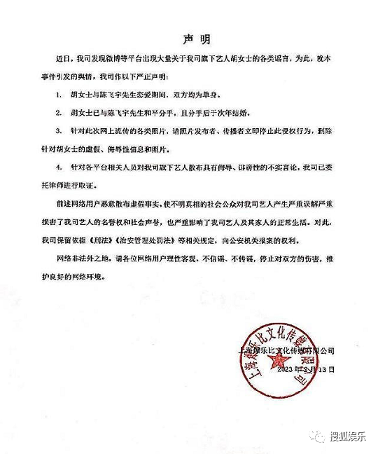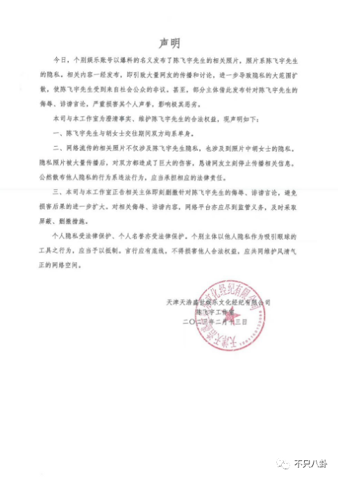 面對來勢洶洶的輿論,就在今晚,陳飛宇方終於發聲明,表示陳飛宇與女網紅胡女士交往期間都是單身。也就是承認了他與女網紅的戀愛關係,但否認是“小三”。