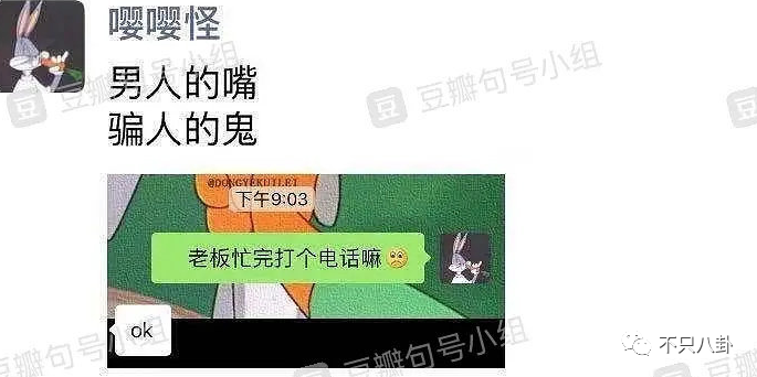 在另一張朋友圈截圖中,她曾給一個男人發微信“老闆忙完打個電話嘛”,對方說ok,但事後並沒有接到電話,於是她吐槽“男人的嘴,騙人的鬼”。