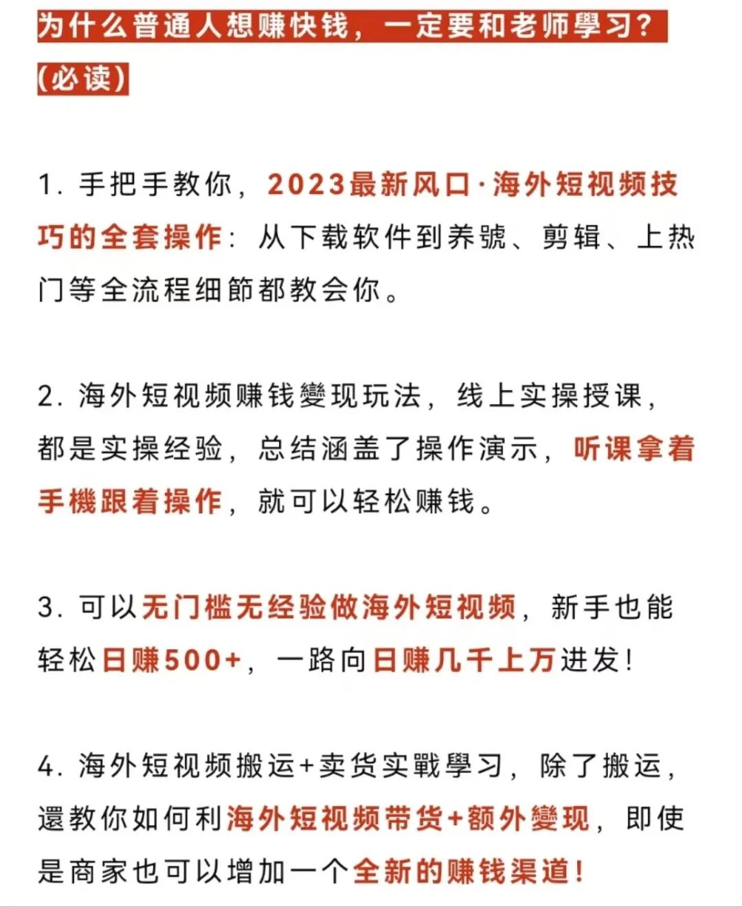 現在,我把【0基礎海外短視頻速成訓練營】 推薦給你,手把手教你賺錢!