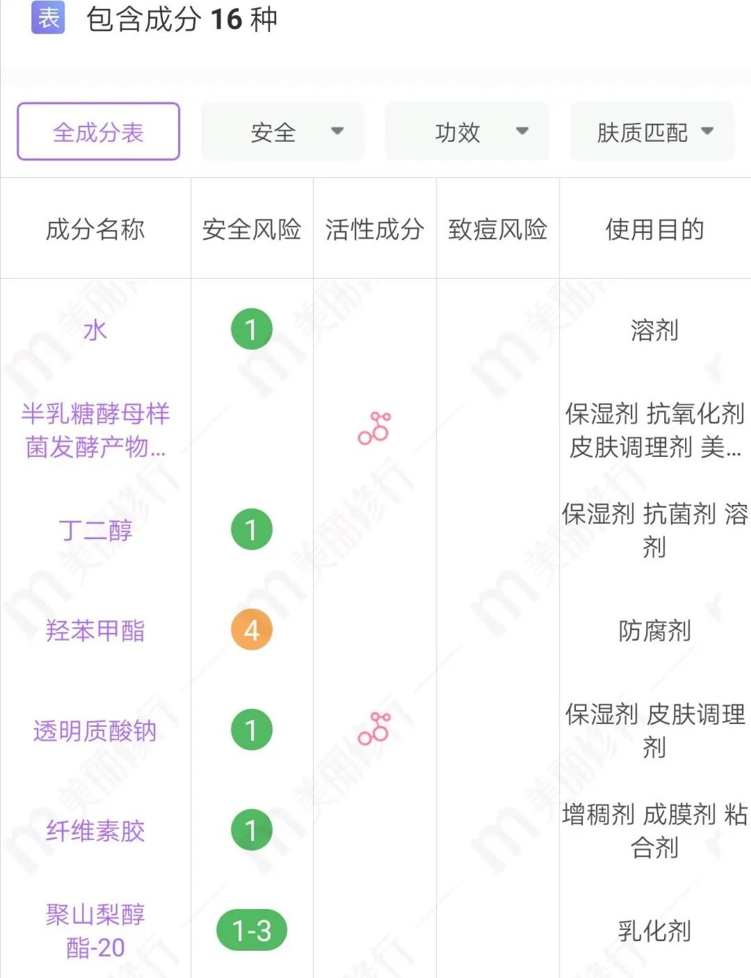 看下成分表,清瑩露中除了PITERA,另外添加了蘋果酸、檸檬酸、乳酸、水楊酸,都是去除老廢角質,疏通毛孔,深層清潔皮膚的成分。