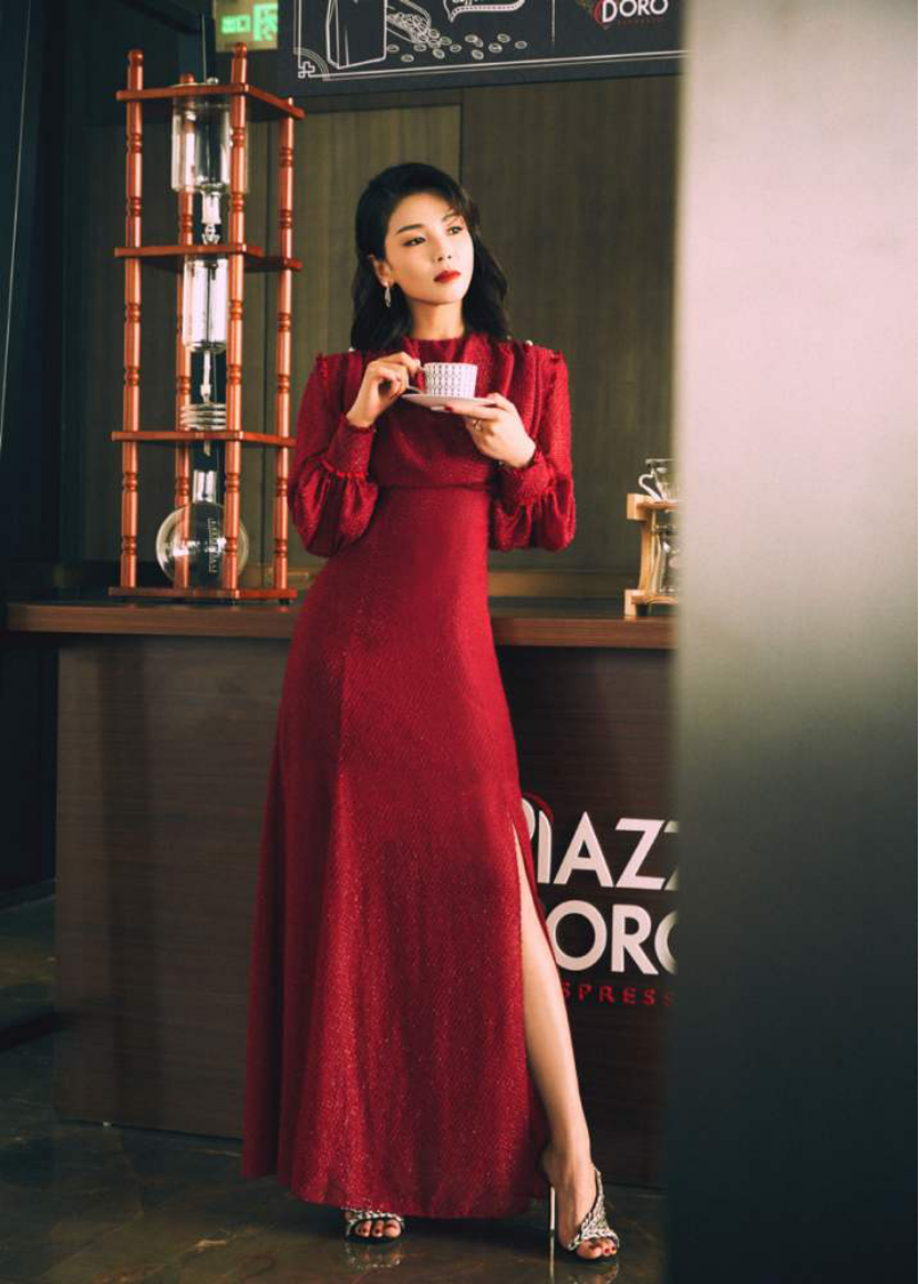 劉濤這一襲紅色高腰開叉長裙氣質滿滿,收腰的設計完美的營造出37分的黃金比例身材,也顯得下半身更修長。雖然劉濤這身打扮走性感路線,但領口的設計卻是圓領,顯得有些許保守,但配上開叉的設計,更給人一種神秘感,讓人覺得又純又欲,這身酒紅色的裙子也是非常襯托出劉濤皮膚白皙,再加上點綴了一些金閃,更顯得十分有氣質,就像是要去參加晚會的貴婦一般,優雅美麗又高貴,只可遠觀而不可褻玩焉。