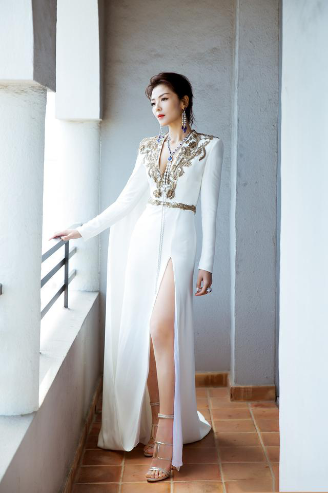 白色的裙子讓劉濤看起來更加高貴,但白色也是非常顯胖的顏色,可劉濤的完美身材很好的駕馭住了這條裙子,一般人穿不出這種氣質。這條裙子的設計非常大膽,港風寫真的開叉設計僅僅露出了劉濤修長的小腿,而這件卻直接開到了大腿根,顯得整個人非常性感,再加上一雙銀色的高跟鞋,更從視覺上讓腿部線條得以修飾,顯出的劉濤曼妙身姿,真的是讓人口水流一地。