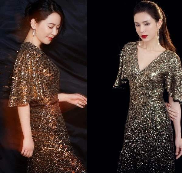 李若彤作為亮片服飾的忠實粉絲,她在各種活動現場都經常有穿亮片的裙裝。比如這件以黑色作為底色的連衣裙,細閃採用的依然是金色亮片,但是它的形狀不規則,設計感滿滿。連衣裙的袖子採用的是中長款的荷葉邊設計,增加了線條的美感,而俞飛鴻的裙子就顯得比較隨性些,和連衣裙中規中矩的版型形成對比,有一種視覺上的衝擊,但是並不違和。