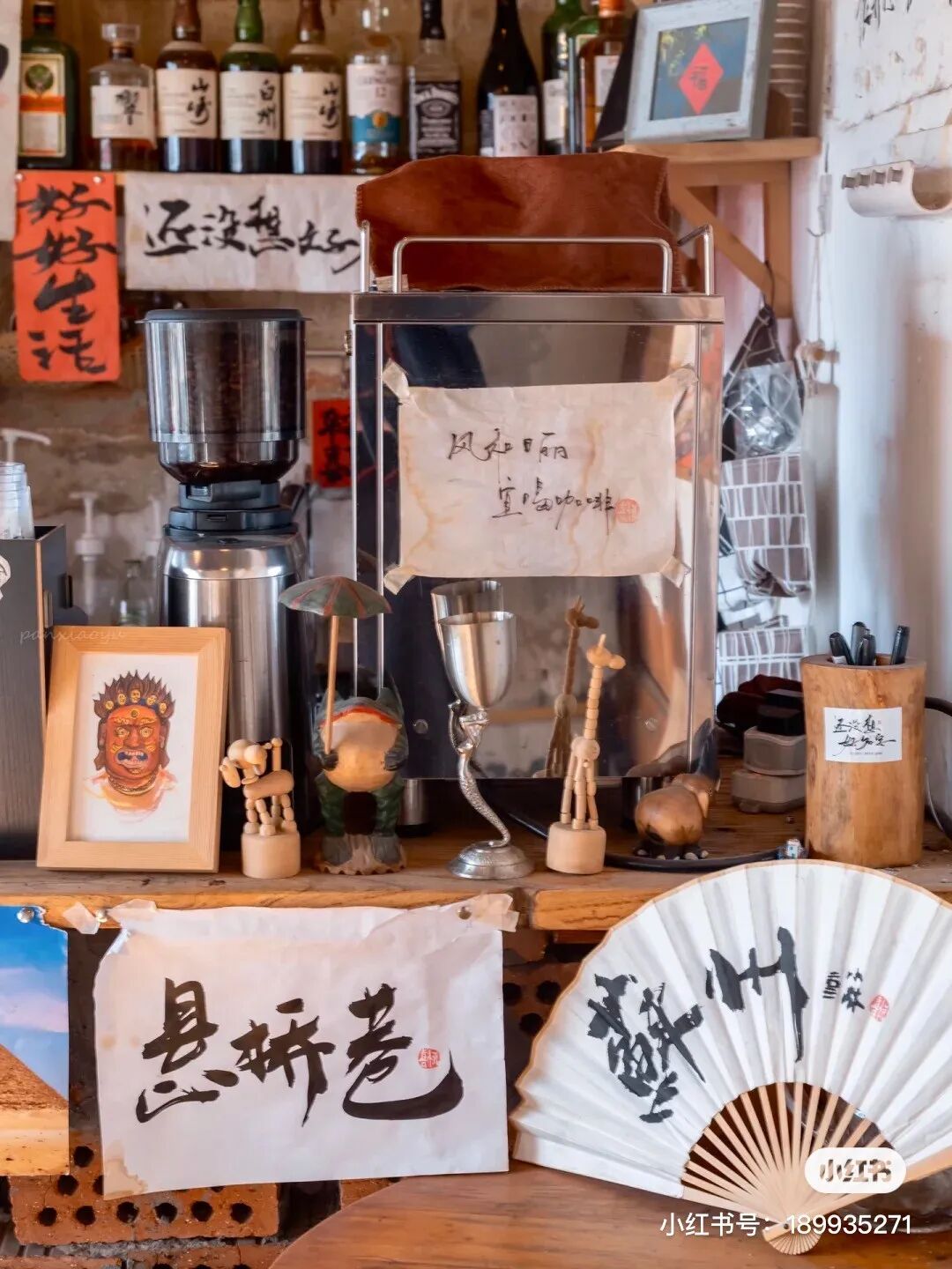 沿街有不少咖啡館,有一家叫【還沒想好名字】,光聽名字就很佛系,整個小屋的設計也是在老房子的基礎上進行改造,保留著古色古香的味道,乍一看以為是雜貨鋪,走近一看才別有洞天。