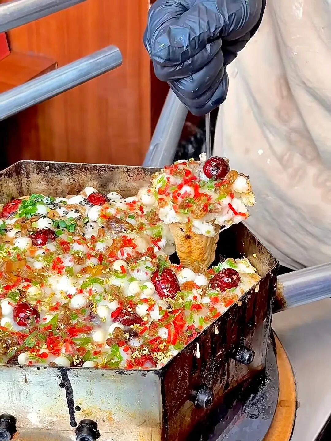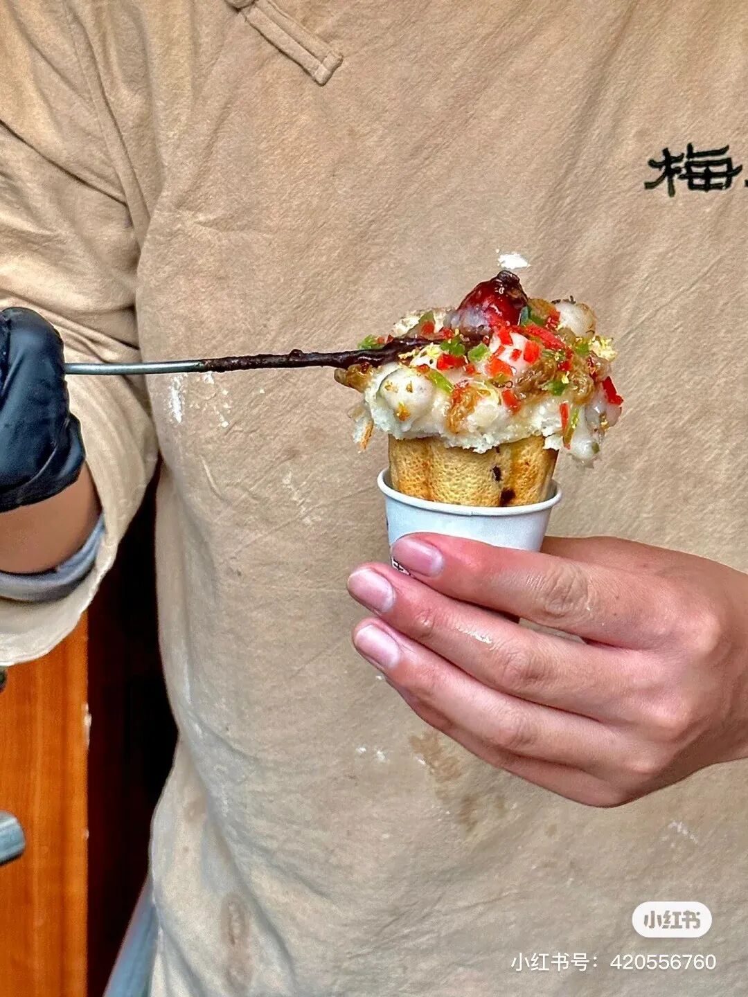 梅花糕裡塞滿著紅豆和糯米,上面還有小丸子,出鍋時再撒上一把幹桂花,熱氣騰騰的,糯嘰嘰星人必嘗試。