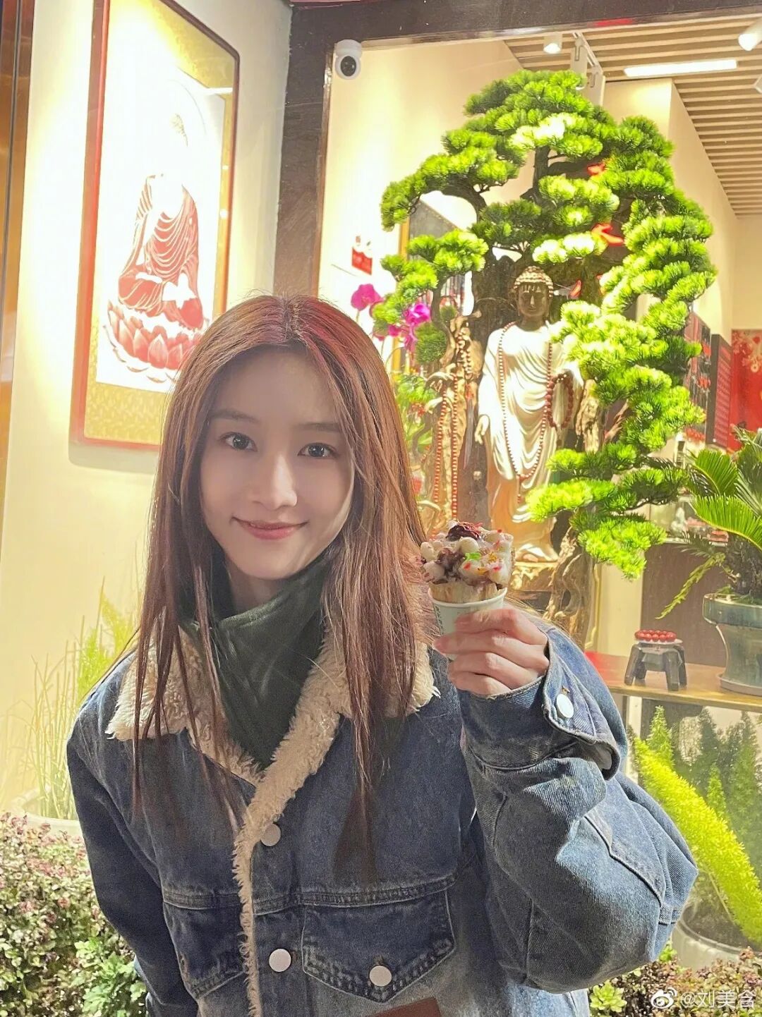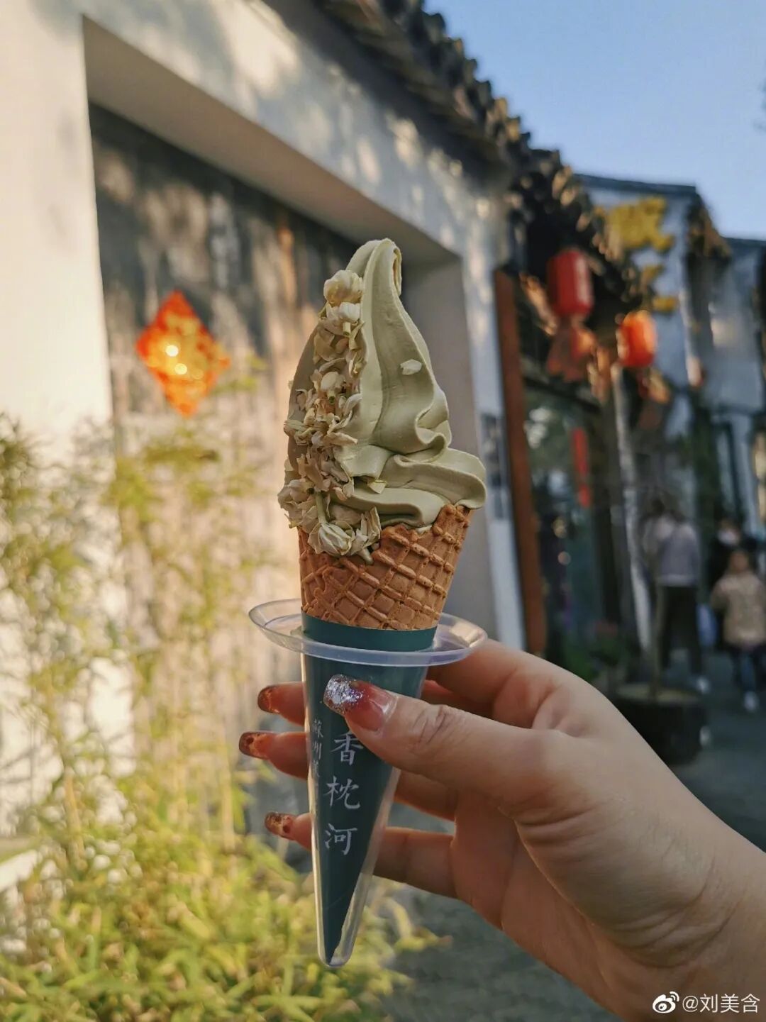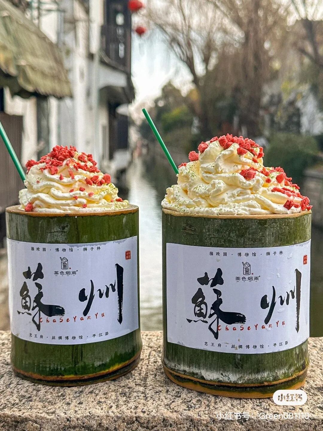 劉美含這次還打卡了一些網紅小店,像是【茶色煙雨】,竹筒的杯身拿在手裡就很有韻味。層層堆疊的奶油頂上撒著些許草莓凍幹,抿一口奶香清幽,在唇齒間回甘。紅白綠的顏色搭配還蠻符合江南意境的。