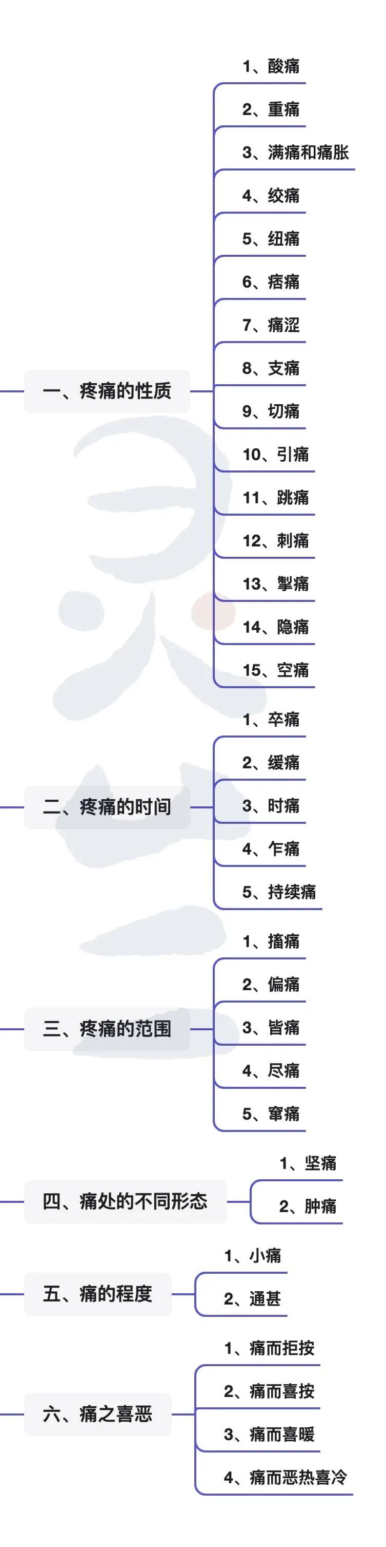為了便於瞭解古人對痛證的描述及各自的表現形式,有利於臨床分析提高療效,而列舉以上數十種不同的痛證。這些表現形式有時單一出現,有時綜合數種同時出現。臨床醫生必須把錯綜複雜的不同疼痛歸納分析辨證治之。