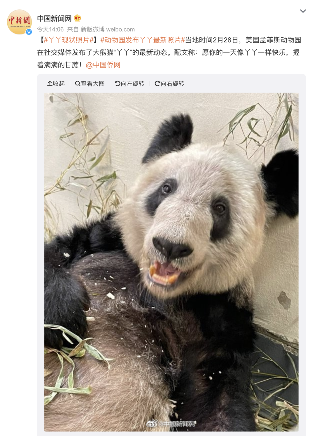 3月1日,孟菲斯發佈了丫丫的近況圖,文案是:願你和丫丫一樣快樂,握著滿滿的甘蔗。
