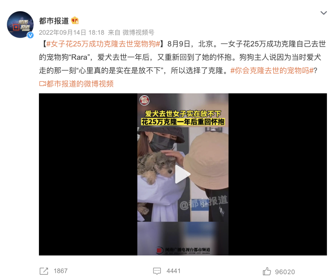 沒錯,目前克隆技術已經相對成熟,網上常常見到有人因為自家貓狗去世,太過痛苦,就花上幾十萬克隆一隻一樣的貓狗。