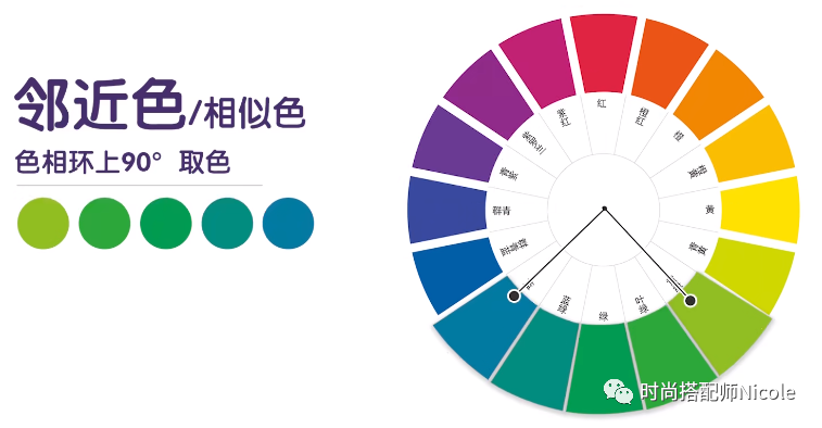 而奶奶的這組搭配就用了兩組鄰近色:黃+綠,藍+綠,所以雖然你看著顏色很豐富卻還是很和諧就是這個道理。