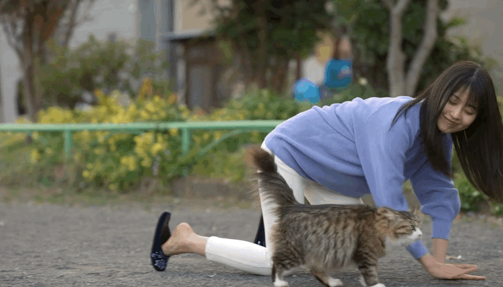 穿著白褲子趴在地上,和小貓一起爬行↓