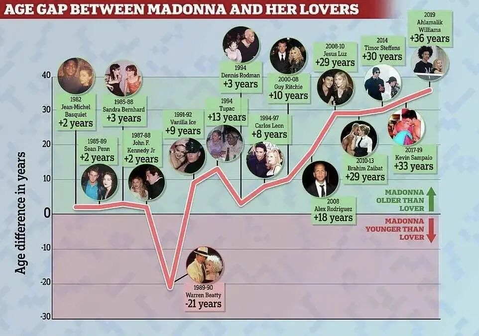 有媒體不完全統計過麥當娜公開的16任男友,其中有15個年齡都比她小。