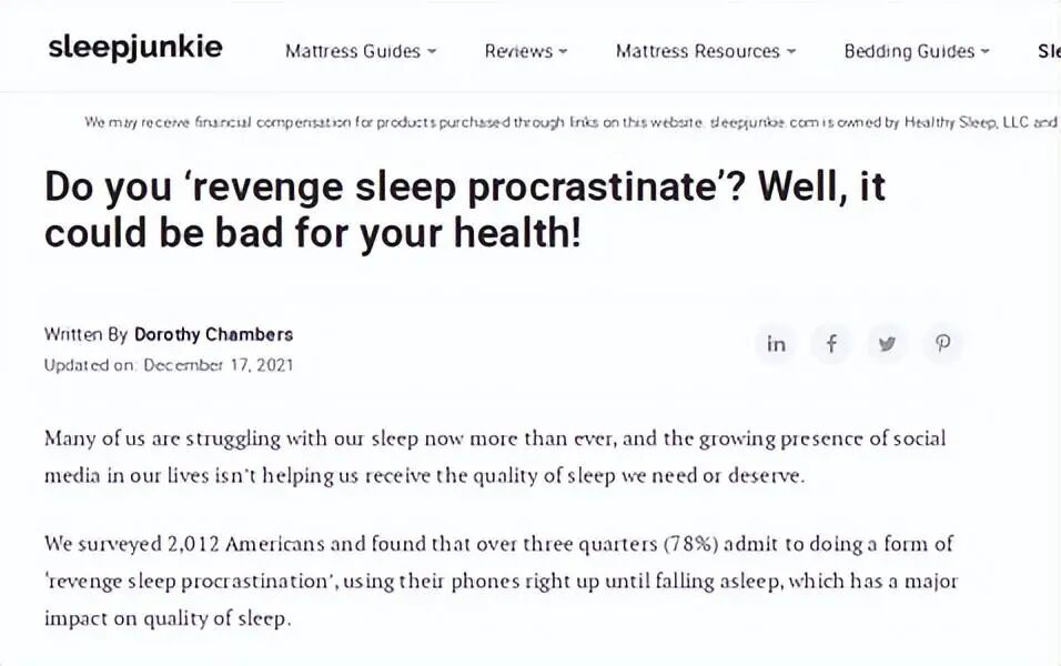 美國一家睡眠評估平臺對2000餘人進行了睡眠數據調查,結果發現其中有78%的受試者有報復性睡眠拖延症,玩完手機後的平均入睡時間需要1小時。