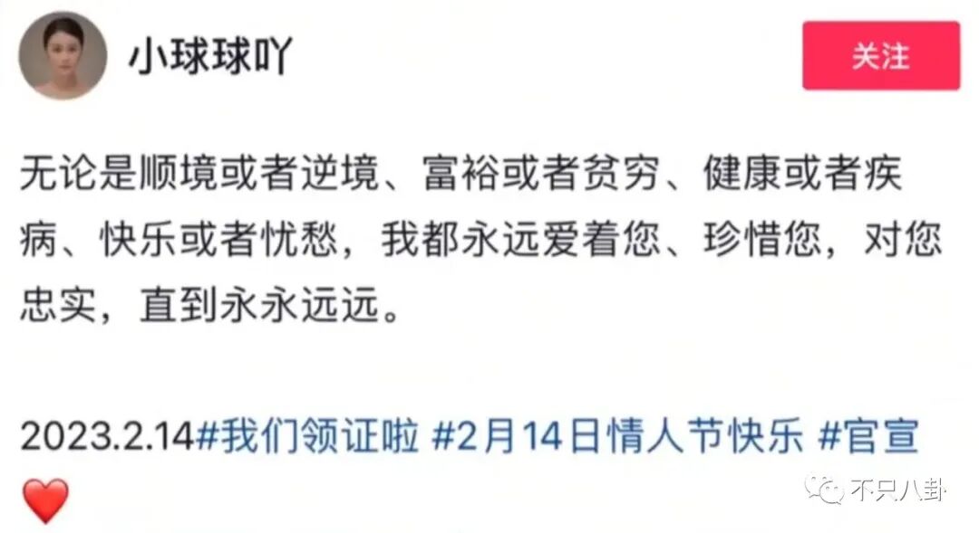 球球還公開表示過,領證以後跟家人吃頓飯就算正式完成儀式了,並不會舉辦婚禮。