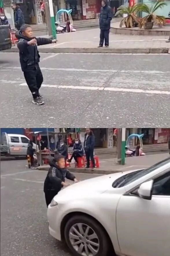網傳視頻中,只見他站在馬路中間,攔住了對面行駛而來的汽車,並向司機要錢。