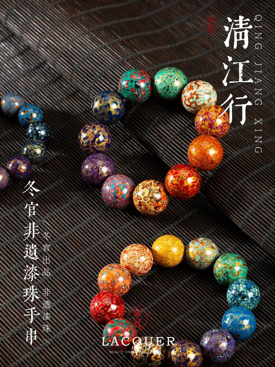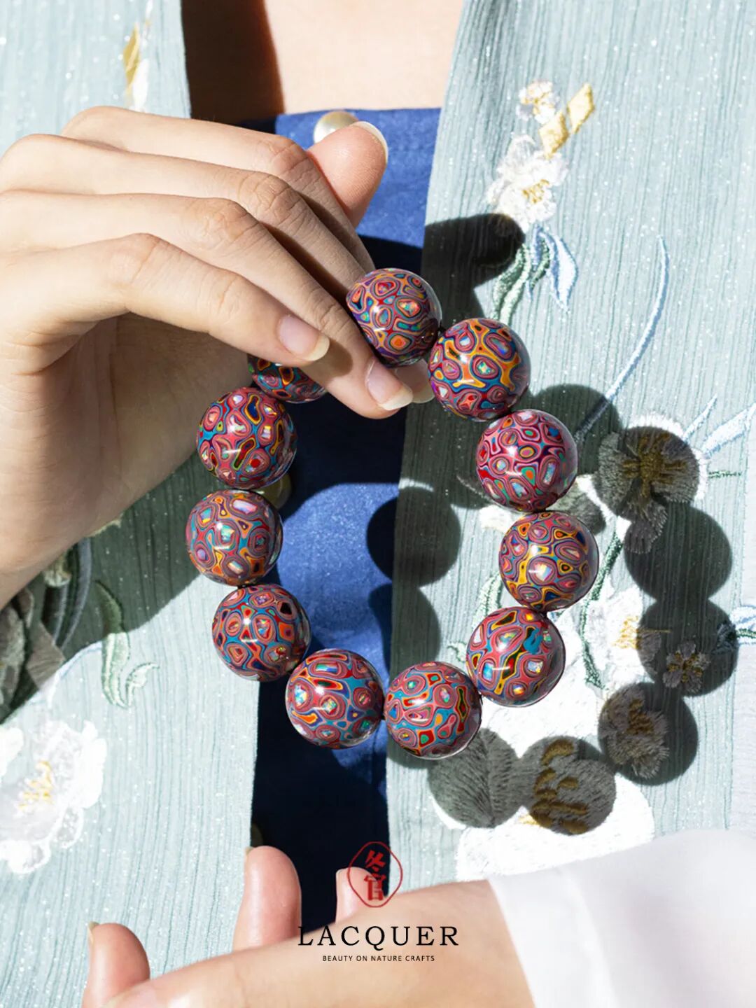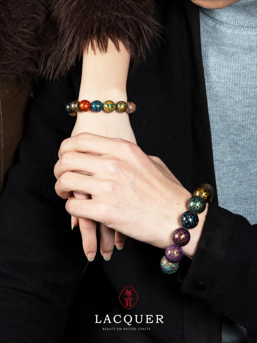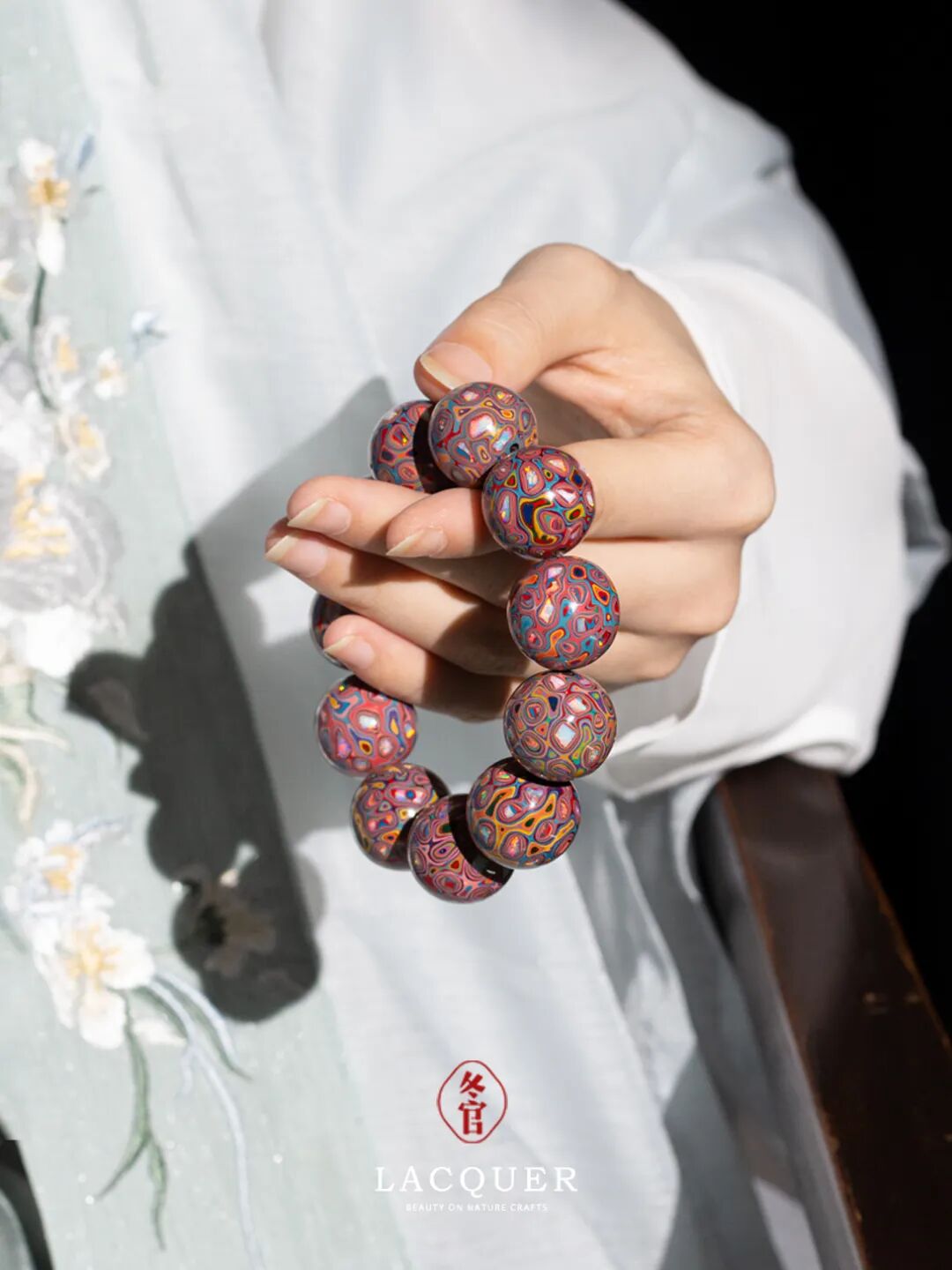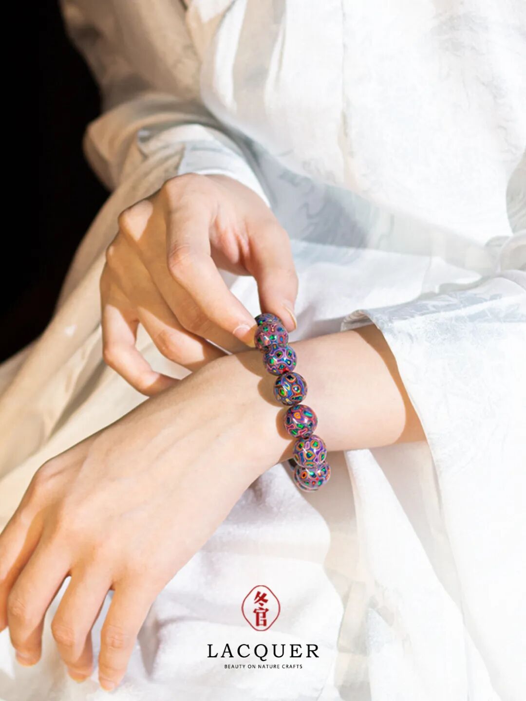 手串由紫木檀做胎底,搭配非遺大漆工藝,漆珠之上,點綴歐泊石英和天然色礦,諸多顏色精彩紛呈,美輪美奐。