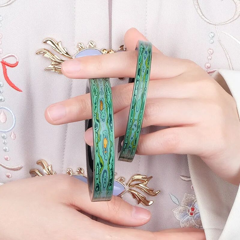 這隻手鐲採用的是傳統菠蘿漆的衍生工藝,通過流水起捻加磨顯的技法,讓手鐲呈現出回婉流動的形態。