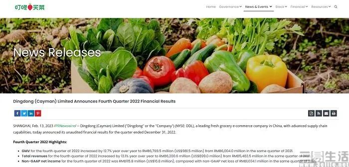 日前,叮咚買菜方面發佈2022年第四季度及全年財報。其中顯示,第四季度其GMV為67.695億元、同比增長12.7%,營收62.006億元、同比增長13.1%,淨利潤4990萬元、上年同期為淨虧損10.963億元,這也是該公司首次實現盈利,Non-GAAP下淨利潤為1.158億元、上年同期為淨虧損10.341億元。2022年全年叮咚買菜的營收為242.2億元、同比增長20.4%,並實現了全年正向經營性現金流。值得一提的是,據叮咚買菜方面透露,2023年一季度儘管受季節性影響,但預計將可實現Non-GAAP口徑下的盈虧平衡,並有信心能在2023年實現Non-GAAP口徑下的盈虧平衡。