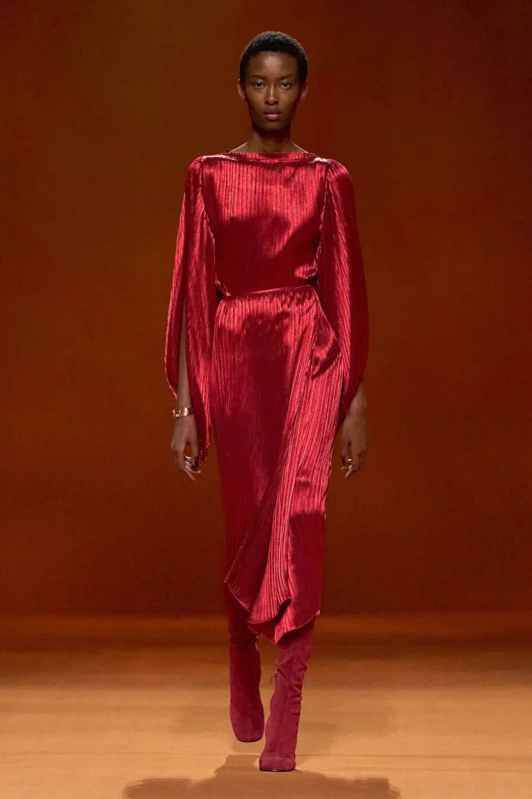 譬如引入注目的方頭過膝絨面靴子,它似乎與所有的一切都相得益彰;從秀場開篇到後續不斷出場的絲質褶皺串珠連衣裙;同時高跟鞋採用倒馬蹄釘製成的優雅錐形,給那些正在尋找細高跟鞋新替代品的女性予以全新的靈感。