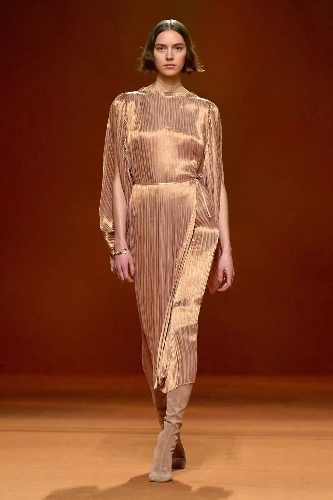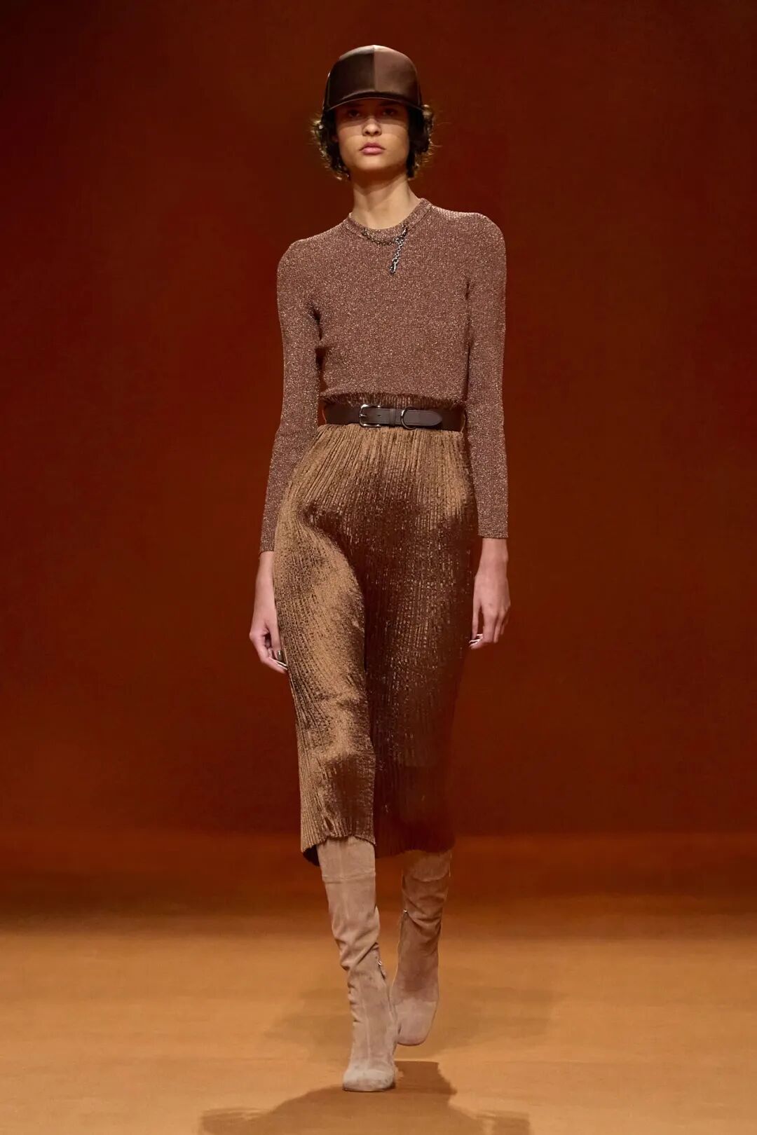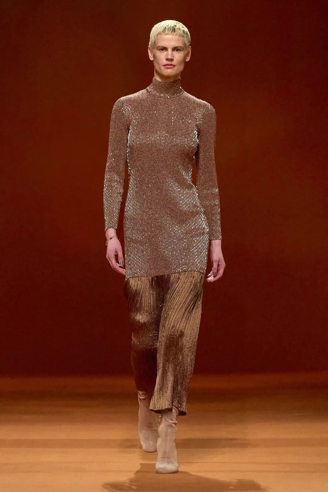 正如樹皮紋理般的金銀線針織背心裙套裝、錘花金屬感的真絲褶襉連衣裙,以及飾以金屬提花或金屬管刺繡的圍裹式褶襉連衣裙,她們包含戶外運動的屬性,但同時也魅力四射,且性感迷人——Nadège Vanhee-Cybulski對於這些戶外元素細節的開發一向樂此不疲,在不斷連續統一的個體中,以巧妙的方式維護著品牌的馬術運動精髓。