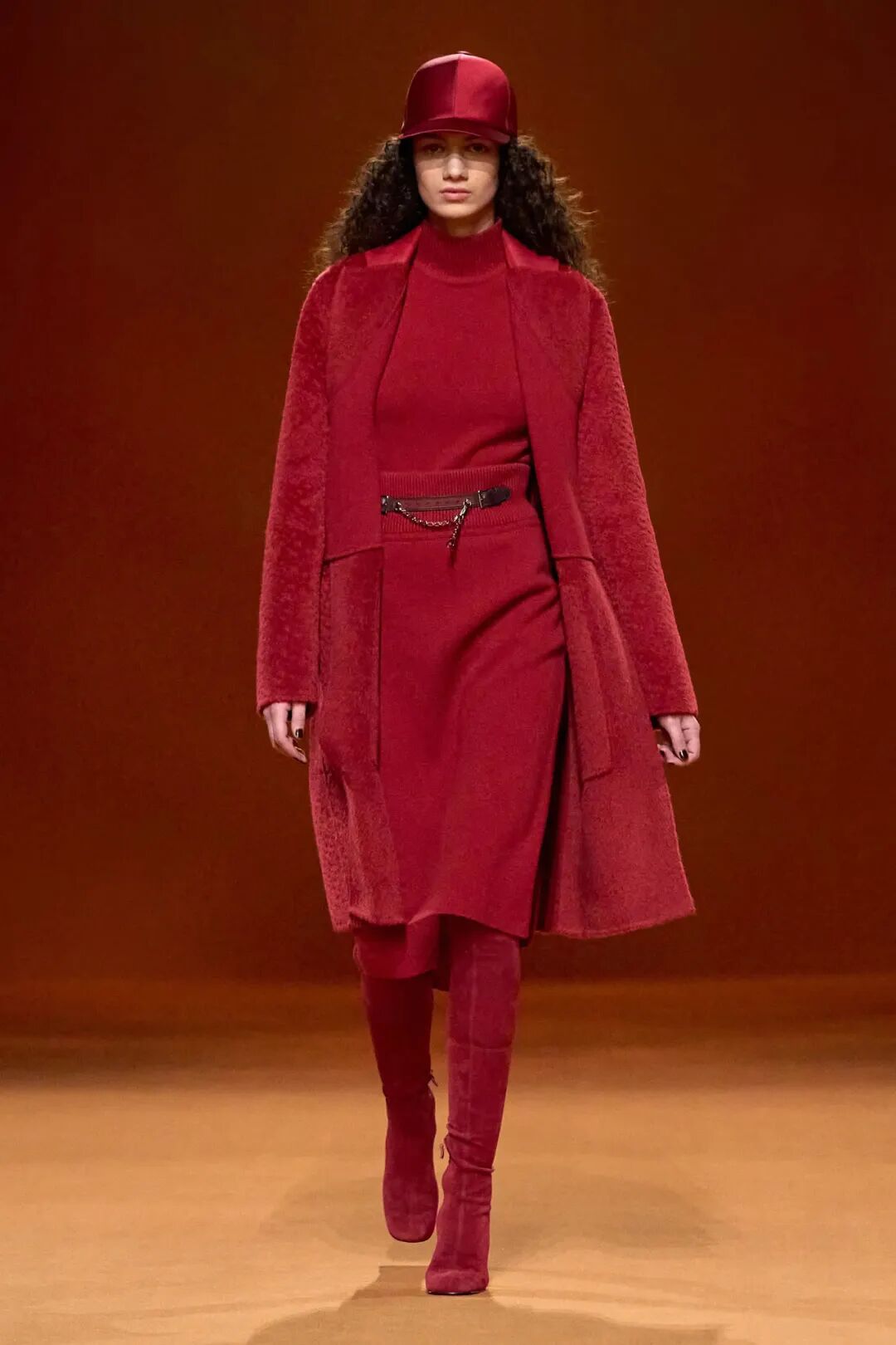開篇的顏色變幻,一如冬日暖陽的層次遞進,閃亮的紅色、棕色、黃色,服裝的表裡都從冬日光線擷取點點輝芒。迴歸Hermes的馬術起源,女性世界創意總監Nadège Vanhee-Cybulski在2023秋冬系列中著裝強調了她眼中的女性在戶外運動時的非凡氣質: