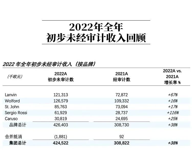 時尚無國界獲悉,Lanvin(復朗集團)日前發佈2022年初步業績顯示,總收入同比大漲38%至4.25億歐元,超過此前預期。報告期內,該集團旗下所有品牌均實現增長,其中Lanvin品牌收入增長67%至1.2億歐元;Wolford品牌收入增長16%至1.27億歐元;Sergio Rossi品牌收入大漲116%至6192萬歐元;St.John品牌收入增長17%至8576萬歐元;Caruso品牌收入增長25%至3082萬歐元。