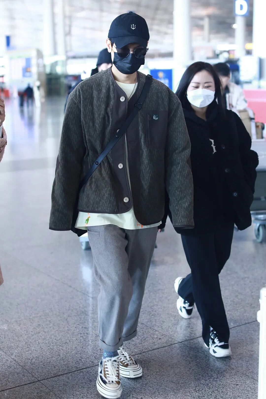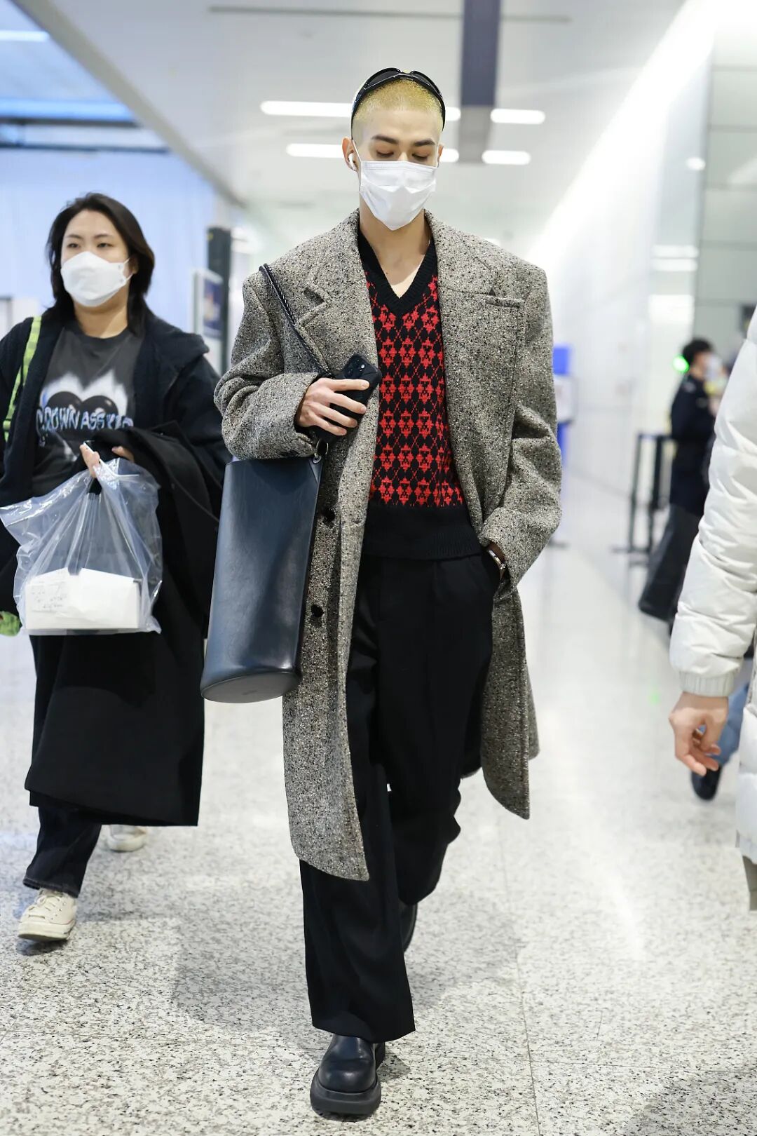 米卡頭上的墨鏡和長款的水桶包在視覺上都設計得恰到好處,自帶高級感的紅黑配色馬甲外搭灰色毛呢大衣,在機場走秀的男模既視感。