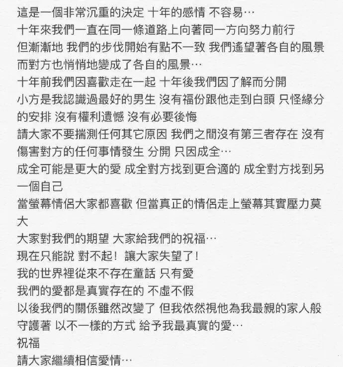 可是就在外界以為兩人相愛十年,好事將近的時候,卻傳出了分手的消息。